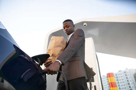 Bottom view of young handsome confident African business man in suit, charging his electric car at the parking station after shopping in trade mall. Focus on charging plug