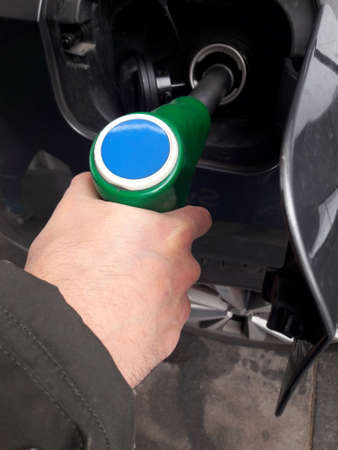 Male hand refilling the car with gas or petrol on filling station, holding a fuel pump outdoor
