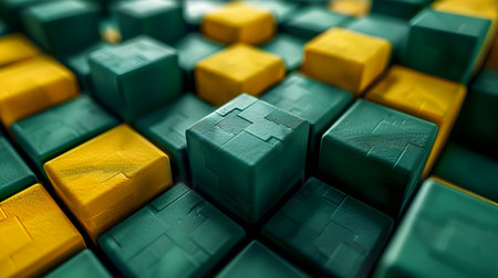 A close-up perspective captures an arrangement of cubes positioned diagonally across the frame. The cubes are presented in a palette of soft pastel colors pink, mint green, and yellow with some featuring a subtle brushed gold metallic finish. The lighting is soft and diffused, emphasizing the smooth, matte textures of the pastel cubes and the gentle sheen of the gold ones. The arrangement is neat and orderly, with the edges of the cubes aligning to create a clean, geometric pattern. The...