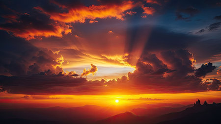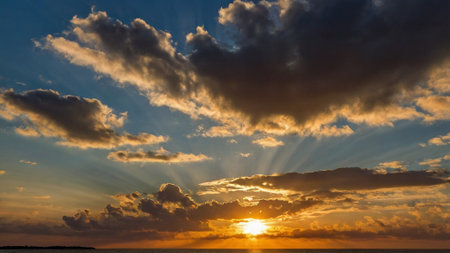 An awe-inspiring image captures a vibrant sunset, showcasing a gradient of warm orange and deep blue hues. The dramatic cloud formations add texture and depth, while sun rays pierce through, creating a sense of wonder. Suitable for illustrating weather, natural beauty, or environmental themes.