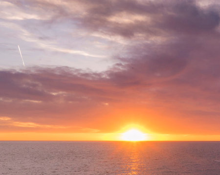 Breathtaking sunset over ocean showcases vibrant hues of orange, pink, and purple, creating serene and tranquil atmosphere. clouds are illuminated by fading sunlight, enhancing beauty of scene