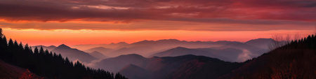 Autumn landscape with fog in the mountains. Fir forest on the hills. Carpathians, Ukraine, Europe