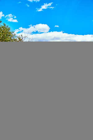 Warm sunny blue sky with fluffy clouds. Sunset sunlight illuminates the sky in sunset time. Beautiful ultra-wide panoramic background of atmosphere