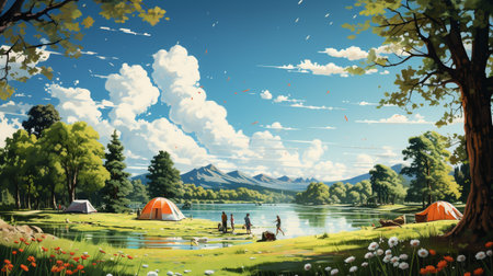 Illustration of a camp on a lake with tourists in the background