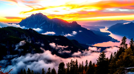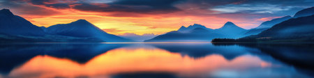 A breathtaking sunset over the mountains, with vibrant colors reflecting on calm waters and creating an enchanting atmosphere. The sky is painted in hues of orange, pink, blue, and purple as sun rays illuminate distant peaks. In front, there's a tranquil lake or sea, reflecting these serene beauty, while nearby islands add to the picturesque scene. This captivating view captures nature at its most radiant moment, creating a mesmerizing visual experience. --ar 121:30 --v 6.1 Job ID: 43801099-7df8-4a98-bbbe-d56db2578082