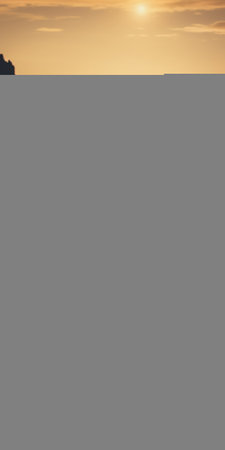This captivating coastal image captures the essence of early dawn with gentle water reflections and a misty horizon, evoking tranquility and peace.