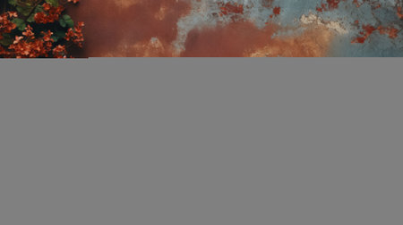 a gray and orange painted wall adorned with vibrant red flowers creates a striking contrast, reminiscent of post-apocalyptic backdrops. this aerial view captures the essence of tabletop photography, showcasing contemporary metallurgy and atmospheric imagery. the tonalism of dark brown and light blue adds depth and intrigue to this captivating scene. ai generated