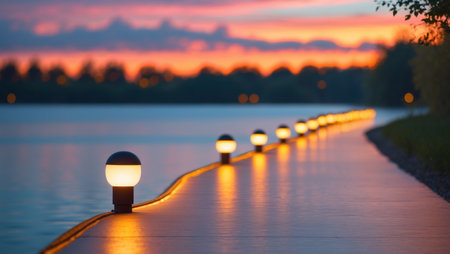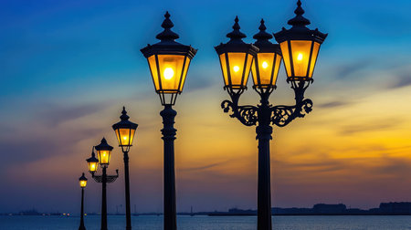 Stunning evening view showcasing vintage street lamps glowing against a colorful dusk sky above a peaceful waterfront, perfect for creating an enchanting ambiance.