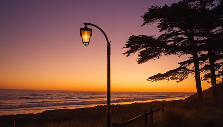 Lamp post against pastel seascape at dusk, serene atmosphere. Tranquility and solitude concept