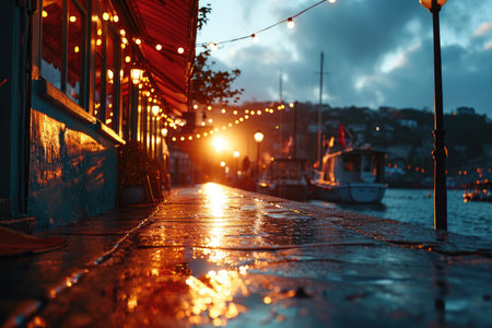 Softly blurred city lights blend into a vibrant sunset as gentle string illumination casts a welcoming glow over tranquil waters, crafting an intimate and inviting scene.