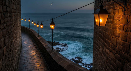A vintage lantern mounted on a seaside balustrade, glowing softly as the sun sets over the ocean.