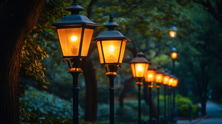 A row of Y shaped street lamps illuminating a quiet evening street, adding charm and elegance to the area.