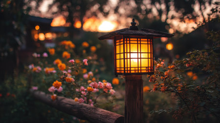 A beautifully lit lantern shines warmly in a garden filled with colorful roses during sunset, creating a serene and romantic atmosphere perfect for relaxation.