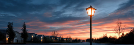 A street lamp is lit up in the evening, casting a warm glow on the surrounding area. The sky is a mix of orange and pink hues, creating a serene and peaceful atmosphere