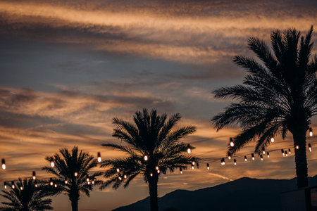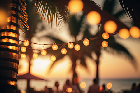 Sunset background of coconut palm trees with bokeh styled yellow string lights in an outdoor restaurant. Generative AI
