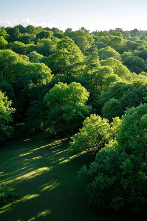 An aerial view of a dense forest canopy, showcasing vibrant green trees bathed in dappled sunlight.