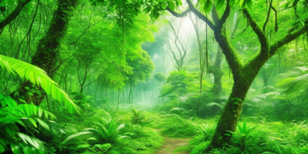 Lush jungle with dense green vegetation and hanging vines in a tropical habitat