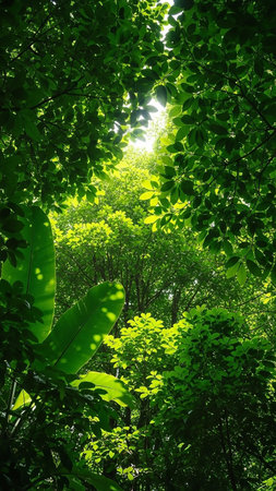 With showing lush green forest canopy with misty valley and sunlight filtering through leaves. resolution use.