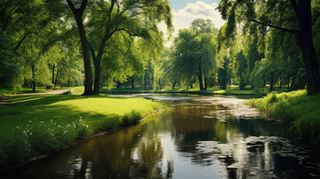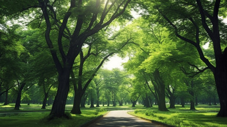 Tranquil Park Landscape with Lush Green Trees, Vibrant Lawn, and Peaceful Shadows for Relaxation