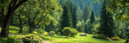 Lush Green Landscape with Majestic Trees and Vibrant Grass Under a Soft Morning Light in Summer