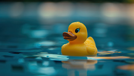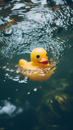 Close-up image of a yellow rubber duck floating on water against a dark, blurred background. The vibrant yellow duck stands out, evoking feelings of relaxation and childhood memories.