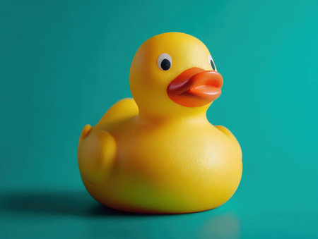 Yellow rubber duck with bright orange beak sits facing right. Smooth glossy texture and round eyes give it a cheerful appearance. Subtle shadow is cast below the duck's base