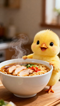Ramen soup steams in a white bowl with sliced pork, noodles and garnishes beside a cheerful yellow chick on a wooden counter. The hot Japanese noodle soup sits in a casual kitchen scene with playful character