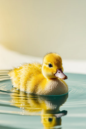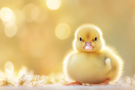 A small yellow duckling with soft feathers sits calmly on a yellow surface. The warm lighting creates a gentle atmosphere, enhancing the ducklings adorable features alongside blurred out siblings.