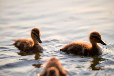 Wild duck family of mother bird and her chicks swimming on lake water at bright sunset. Birdwatching concept