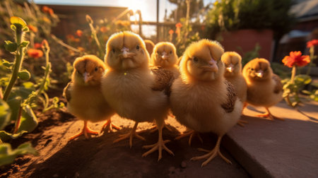 Selfie of chickens in a sunny botanical garden. Playful interaction of chickens in a lush garden. Generative AI