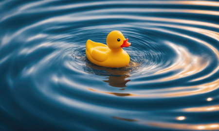 A yellow rubber duck floats in a still pond, creating ripples in the water