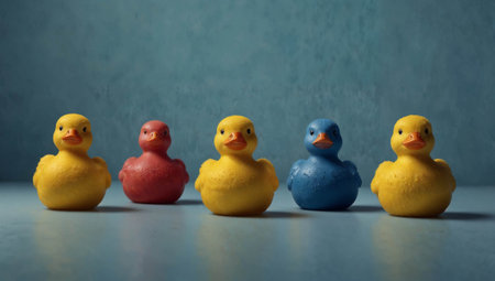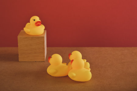 Rubber ducklings on trendy blue background. Minimal abstract summer, teamwork or fashion concept. With copy space.