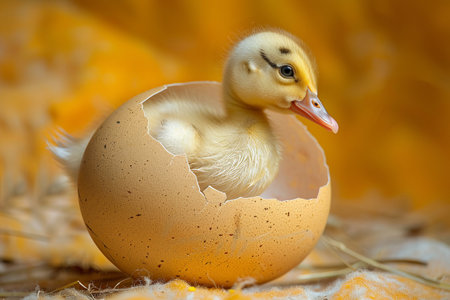 Adorable Duckling Emerging from Egg against a Warm Yellow Background. Symbol of Birth and Renewal --ar 3:2 --v 6 Job ID: 52b0b15d-3937-490e-bb9c-659c27ac69b4