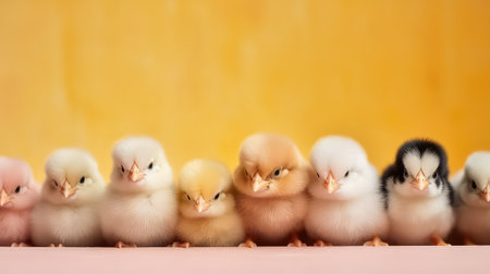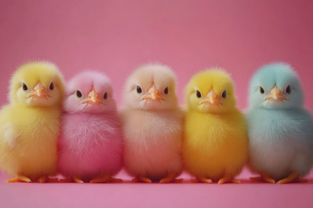 Five colorful chicks are standing in a row on a pink background, creating a vibrant and adorable scene
