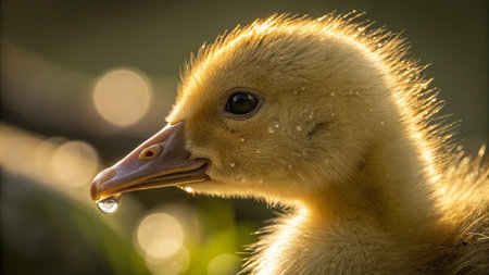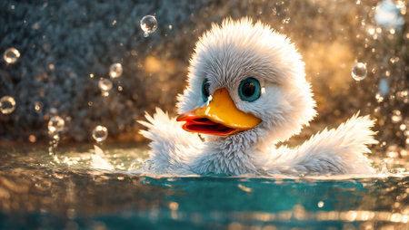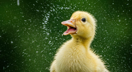 A cheerful baby duckling, its soft yellow feathers glistening with water droplets, enjoys a refreshing splash in the natural outdoor environment with a deep green bokeh background.
