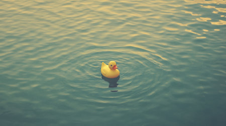 Beautiful, offbeat close-up of a rubber duck floating in glassy ocean, pastel-toned advertising photo