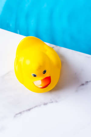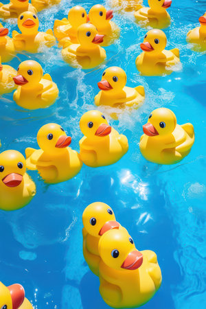 Yellow rubber ducks floating in the swimming pool with blue water background.