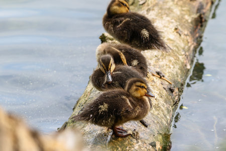 Close-up of wild duckling relaxing on fallen tree trunk by lake near Regensburg during springtime