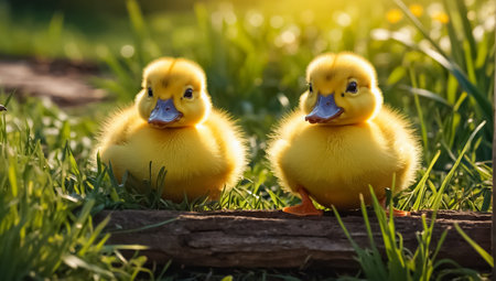 A charming view of two soft, yellow baby chicks nestled among vibrant green grass. The chicks are close together, possibly siblings, enjoying the sunlit outdoor environment. A scene full of cuteness.