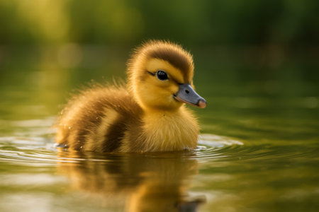 A fluffy duckling paddling gracefully in calm water surrounded by lush greenery