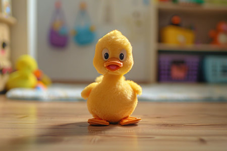 Colorful playroom scene with a cute yellow duck toy among various toys scattered on the floor