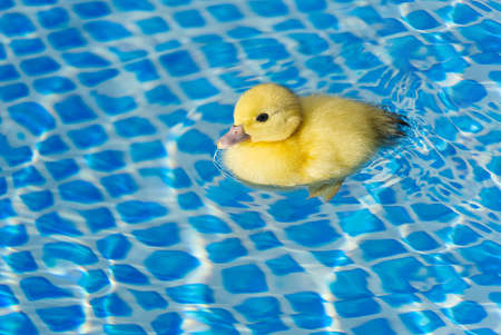 Yellow small cute duckling in swimming pool. Duckling swimming in crystal clear blue water sunny summer day.