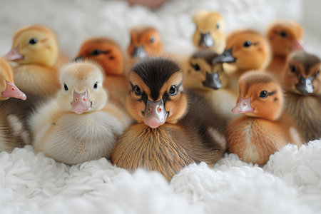 Top view of a farm's ducklings paddling in a shallow pool, with their fluffy feathers and tiny beaks visible.