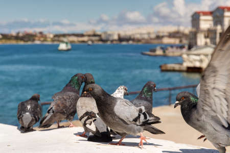 Pigeons A flock of pigeons in the town square in summer close-up.