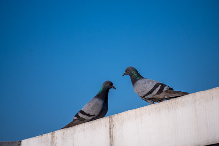Two black and white rock pigeon bird (columba livia)standing perched on electric wires with bright blue sky and vast space
