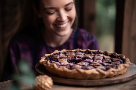 Close-up portrait of a smiling woman with a slice of succulent mulberry pie on a rustic wooden table