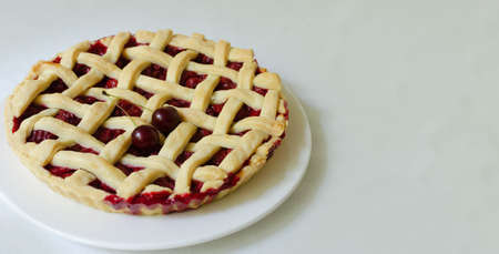 Homemade cherry pie on a large white plate on a white tablecloth on the table. The concept of traditional baking. Seasonal pie. horizontal orientation. Banner. copy space