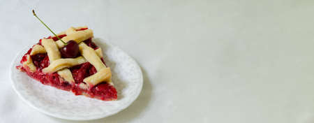 A piece of Homemade Cherry Pie with Flaky Crust on a white saucer on a white tablecloth on the table. The concept of traditional baking. Seasonal pie. horizontal orientation. banner