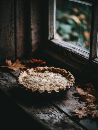A delicious pie sits on a wooden windowsill with sunlight filtering through the glass, framed by colorful autumn leaves, evoking a warm atmosphere.