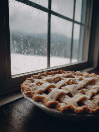 Delicate pie rests on a wooden table near a window, raindrops trace the glass as misty mountains loom in the distance, creating a serene atmosphere.